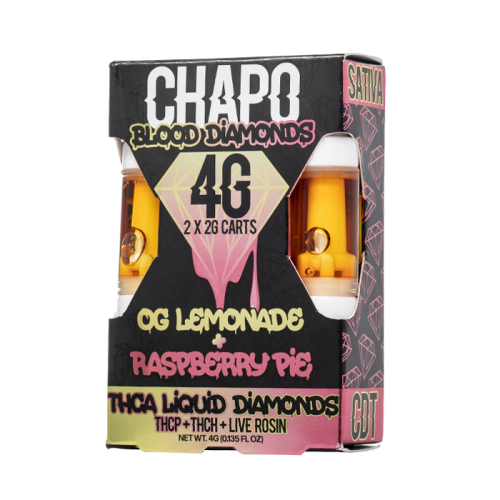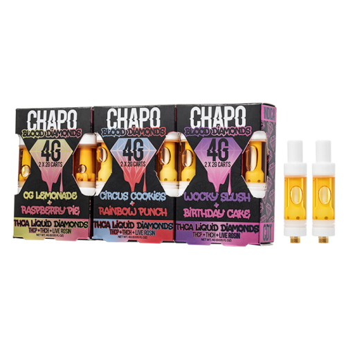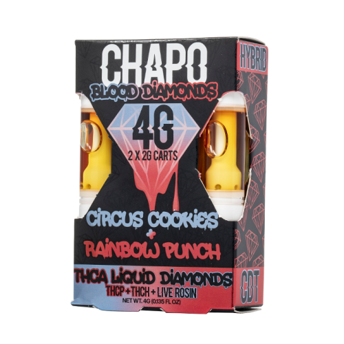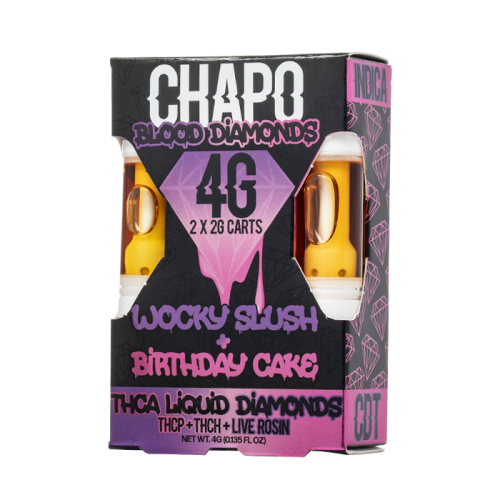 Shop Chapo Extrax Blood Diamonds Cartridge, featuring two 2 gram 510 cartridges, each filled with THC-A Liquid Diamonds, THC-P, and THC-H to create a delicious but satisfying blend.